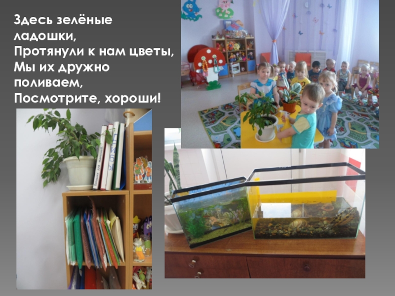 Здесь зелёные ладошки, Протянули к нам цветы, Мы их дружно поливаем, Посмотрите, хороши!