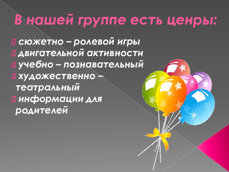 В нашей группе есть ценры: сюжетно – ролевой игры двигательной активности учебно – познавательный художественно – театральный