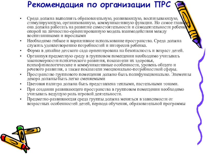 Рекомендация по организации ПРС  Среда должна выполнять образовательную, развивающую, воспитывающую, стимулирующую, организованную, коммуникативную функции. Но самое