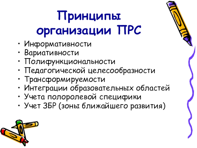 Принципы организации ПРСИнформативности Вариативности  Полифункциональности Педагогической целесообразности Трансформируемости Интеграции образовательных областейУчета полоролевой специфики Учет ЗБР (зоны ближайшего развития)
