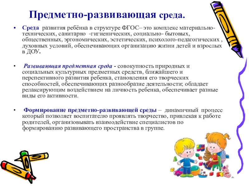 Развивающая предметная среда - совокупность природных и социальных культурных предметных средств, ближайшего и перспективного развития ребенка, становления его творческих способностей, обеспечивающих разнообразие деятельности; обладает релаксирующим воздействием на личность ребенка, обеспечивает разные виды его активности.