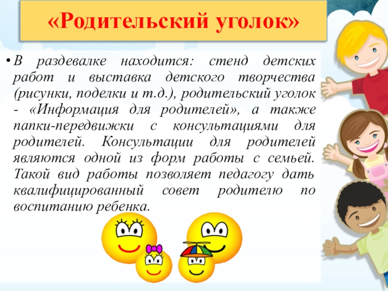 поделки и т.д.), родительский уголок - «Информация для родителей», а также папки-передвижки с консультациями для родителей. Консультации для родителей являются одной из форм работы с семьей. Такой вид работы позволяет педагогу дать квалифицированный совет родителю по воспитанию ребенка.