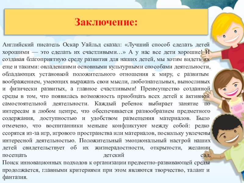 это сделать их счастливыми…» А у нас все дети хорошие! И создавая благоприятную среду развития для наших детей, мы хотим видеть их еще и такими: овладевшими основными культурными способами деятельности, обладающих установкой положительного отношения к миру, с развитым воображением, умеющих выражать свои мысли, любознательных, выносливых и физически развитых, а главное счастливыми! Преимущество созданной среды в том, что появилась возможность приобщать всех детей к активной самостоятельной деятельности. Каждый ребенок выбирает занятие по интересам в любом центре, что обеспечивается разнообразием предметного содержания, доступностью и удобством размещения материалов. Было отмечено, что воспитанники меньше конфликтуют между собой: редко ссорятся из-за игр, игрового пространства или материалов, поскольку увлечены интересной деятельностью. Положительный эмоциональный настрой наших детей свидетельствует об их жизнерадостности, открытости, желании посещать детский сад.