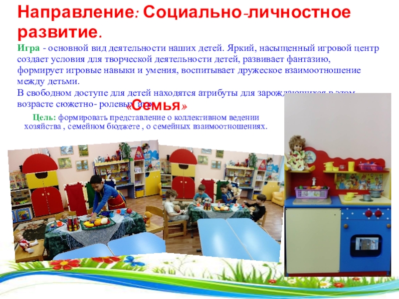 насыщенный игровой центр создает условия для творческой деятельности детей, развивает фантазию, формирует игровые навыки и умения, воспитывает дружеское взаимоотношение между детьми.