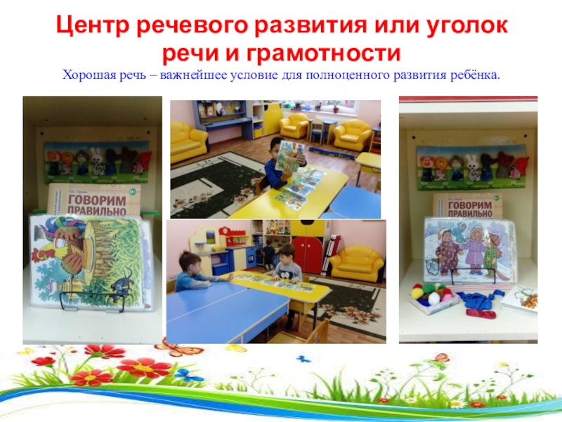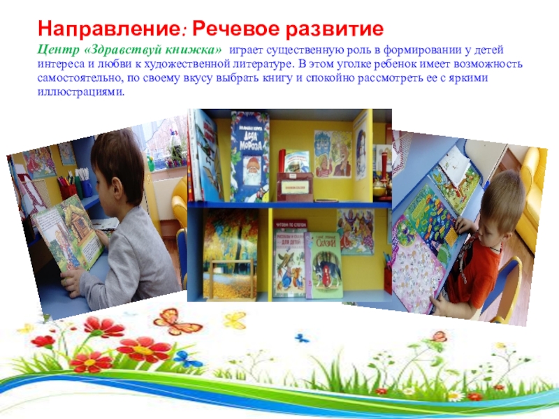 Центр «Здравствуй книжка» играет существенную роль в формировании у детей интереса и любви к художественной литературе. В этом уголке ребенок имеет возможность самостоятельно, по своему вкусу выбрать книгу и спокойно рассмотреть ее с яркими иллюстрациями.