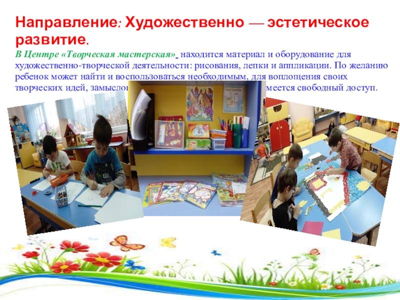 Центре «Творческая мастерская» находится материал и оборудование для художественно-творческой деятельности: рисования, лепки и аппликации. По желанию ребенок может найти и воспользоваться необходимым, для воплощения своих творческих идей, замыслов, фантазии. К данному центру имеется свободный доступ.