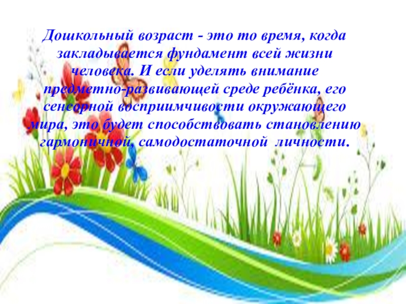 человека. И если уделять внимание предметно-развивающей среде ребёнка, его сенсорной восприимчивости окружающего мира, это будет способствовать становлению гармоничной, самодостаточной личности.