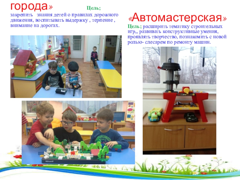 «Автомастерская» Цель; расширить тематику строительных игр,, развивать конструктивные умения, проявлять творчество, познакомить с новой ролью- слесарем по ремонту машин.
