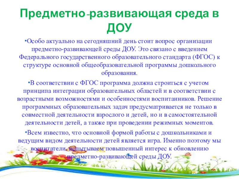 предметно-развивающей среды ДОУ. Это связано с введением Федерального государственного образовательного стандарта (ФГОС) к структуре основной общеобразовательной программы дошкольного образования.