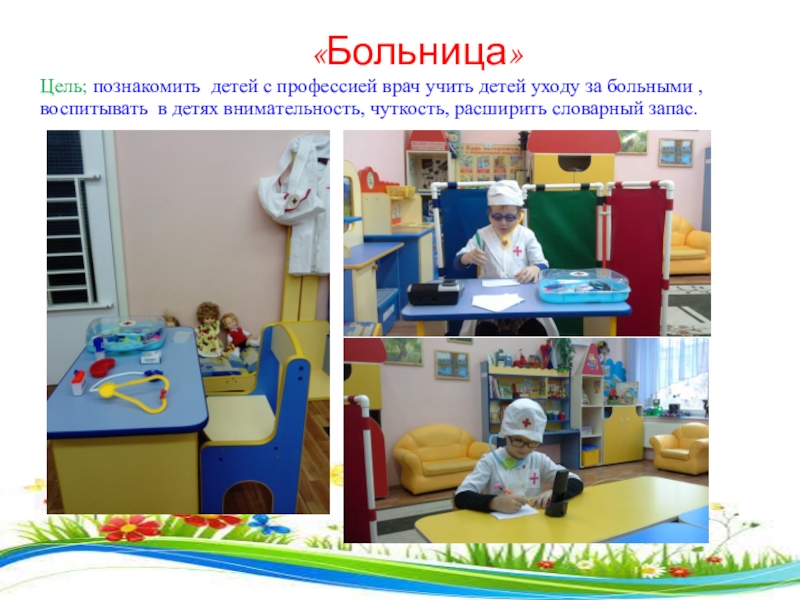 Цель; познакомить детей с профессией врач учить детей уходу за больными , воспитывать в детях внимательность, чуткость, расширить словарный запас.