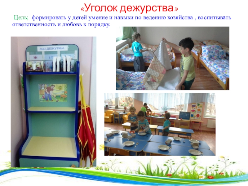 Цель; формировать у детей умение и навыки по ведению хозяйства , воспитывать ответственность и любовь к порядку.
