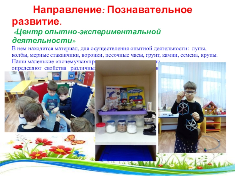 В нем находится материал, для осуществления опытной деятельности: лупы, колбы, мерные стаканчики, воронки, песочные часы, грунт, камни, семена, крупы. Наши маленькие «почемучки»проводят несложные опыты,определяют свойства различных природных материалов.
