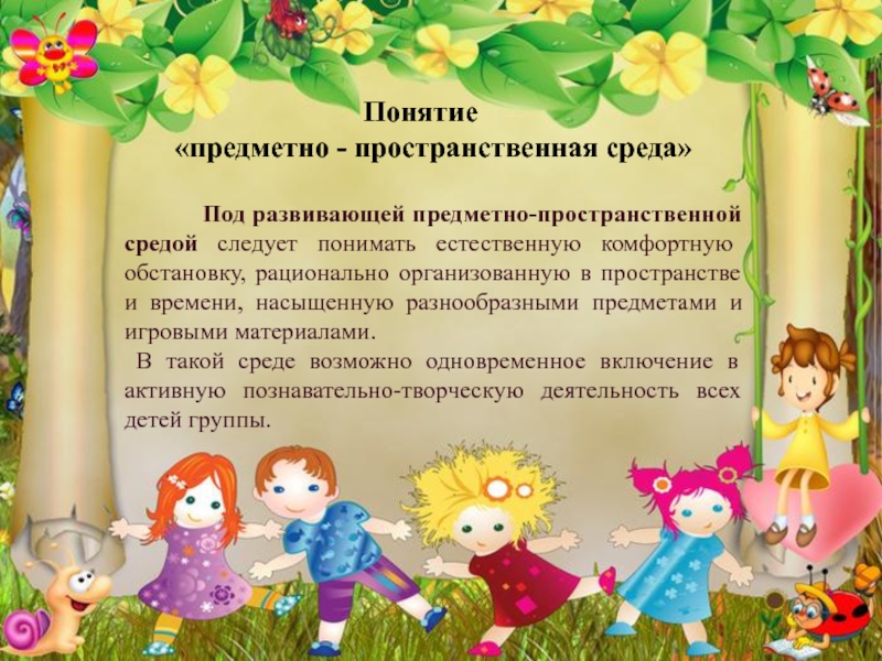 Под развивающей предметно-пространственной средой следует понимать естественную комфортную обстановку, рационально организованную в пространстве и времени, насыщенную разнообразными предметами и игровыми материалами.