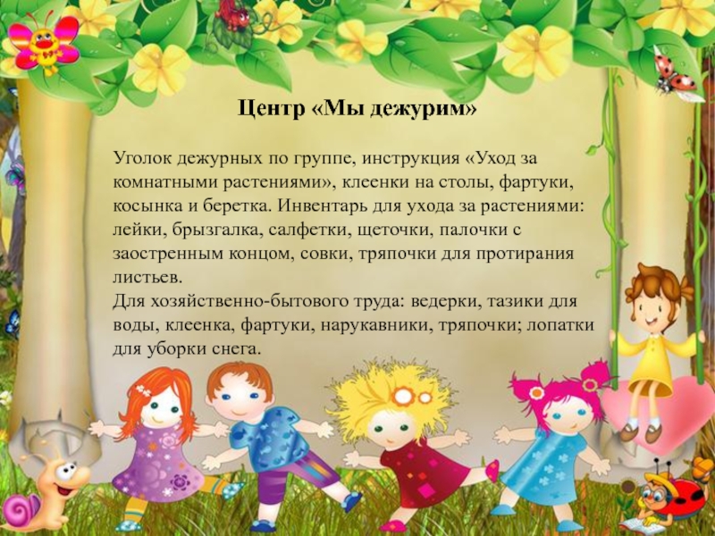 клеенки на столы, фартуки, косынка и беретка. Инвентарь для ухода за растениями: лейки, брызгалка, салфетки, щеточки, палочки с заостренным концом, совки, тряпочки для протирания листьев.