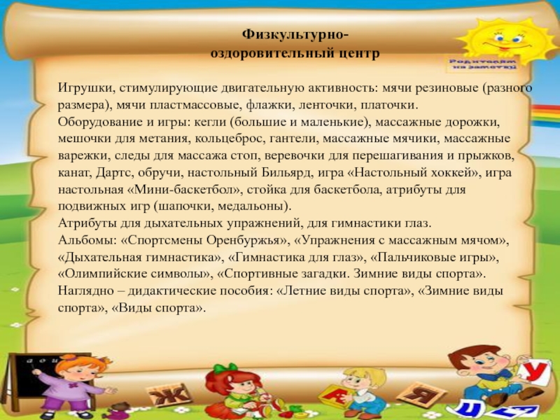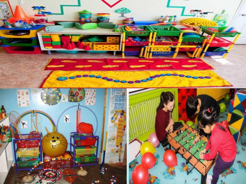 Оборудование и игры: кегли (большие и маленькие), массажные дорожки, мешочки для метания, кольцеброс, гантели, массажные мячики, массажные варежки, следы для массажа стоп, веревочки для перешагивания и прыжков, канат, Дартс, обручи, настольный Бильярд, игра «Настольный хоккей», игра настольная «Мини-баскетбол», стойка для баскетбола, атрибуты для подвижных игр (шапочки, медальоны).