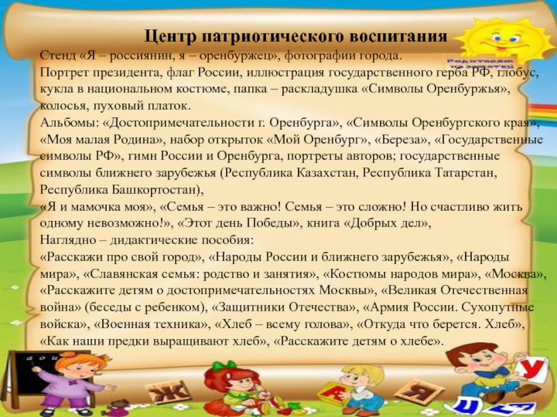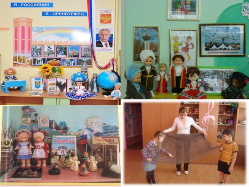 Портрет президента, флаг России, иллюстрация государственного герба РФ, глобус, кукла в национальном костюме, папка – раскладушка «Символы Оренбуржья», колосья, пуховый платок.
