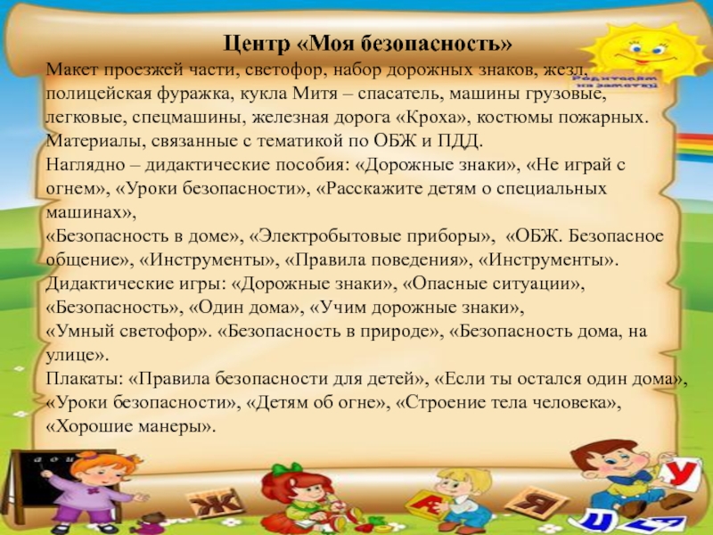 Плакаты: «Правила безопасности для детей», «Если ты остался один дома», «Уроки безопасности», «Детям об огне», «Строение тела человека», «Хорошие манеры».