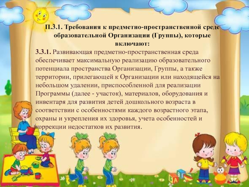Слайд 4П.3.1. Требования к предметно-пространственной среде образовательной Организации (Группы), которые включают: