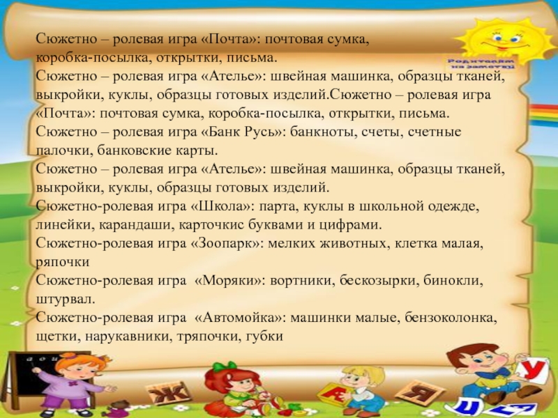 – ролевая игра «Ателье»: швейная машинка, образцы тканей, выкройки, куклы, образцы готовых изделий.Сюжетно – ролевая игра «Почта»: почтовая сумка, коробка-посылка, открытки, письма.