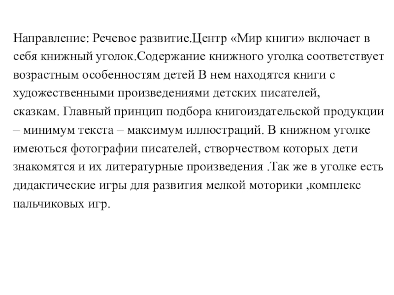 Слайд 5Направление: Речевое развитие.Центр «Мир книги» включает в