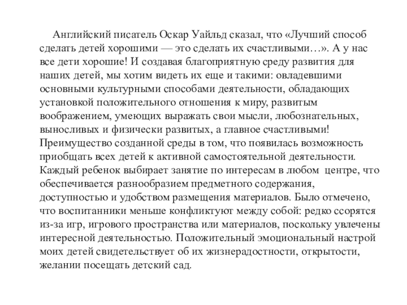 «Лучший способ сделать детей хорошими — это сделать их счастливыми…». А у нас все дети хорошие! И создавая благоприятную среду развития для наших детей, мы хотим видеть их еще и такими: овладевшими основными культурными способами деятельности, обладающих установкой положительного отношения к миру, развитым воображением, умеющих выражать свои мысли, любознательных, выносливых и физически развитых, а главное счастливыми! Преимущество созданной среды в том, что появилась возможность приобщать всех детей к активной самостоятельной деятельности. Каждый ребенок выбирает занятие по интересам в любом центре, что обеспечивается разнообразием предметного содержания, доступностью и удобством размещения материалов. Было отмечено, что воспитанники меньше конфликтуют между собой: редко ссорятся из-за игр, игрового пространства или материалов, поскольку увлечены интересной деятельностью. Положительный эмоциональный настрой моих детей свидетельствует об их жизнерадостности, открытости, желании посещать детский сад.