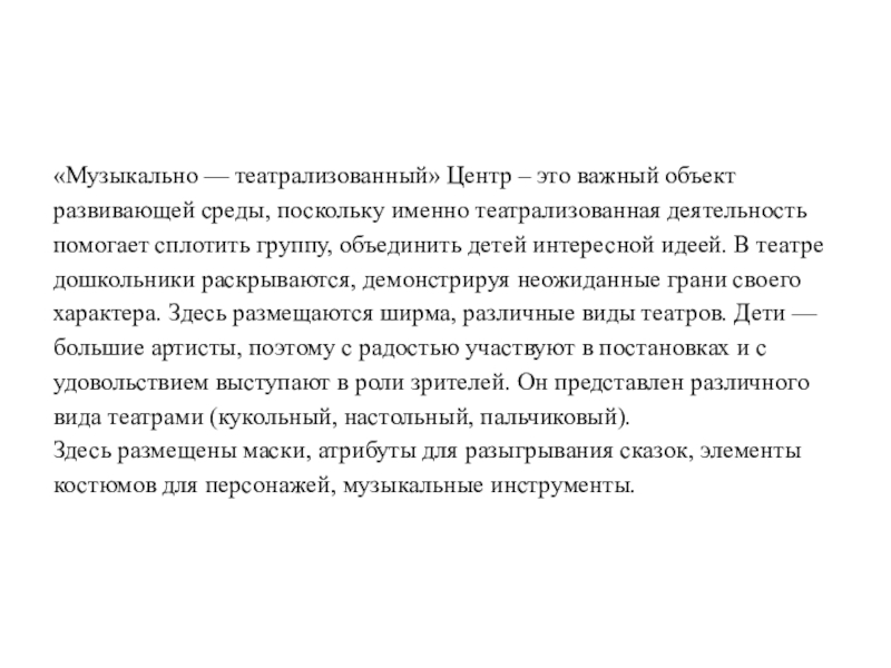 Слайд 17«Музыкально — театрализованный» Центр – это важный объект