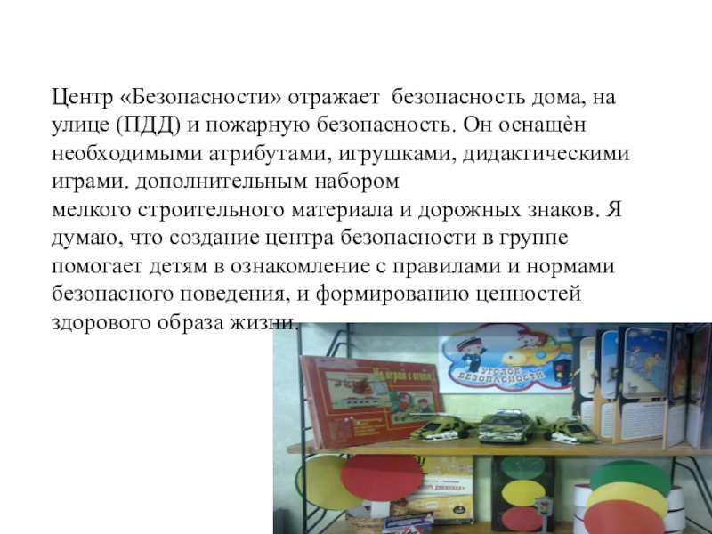 мелкого строительного материала и дорожных знаков. Я думаю, что создание центра безопасности в группе помогает детям в ознакомление с правилами и нормами безопасного поведения, и формированию ценностей здорового образа жизни.