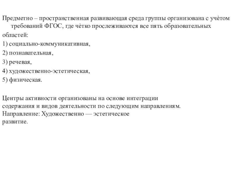Слайд 2Предметно – пространственная развивающая среда группы организована с учѐтом требований ФГОС,