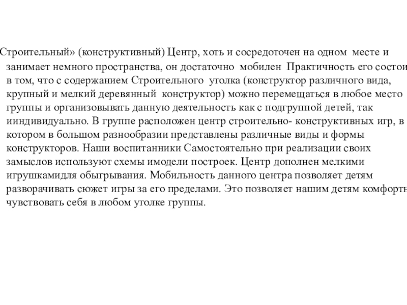 Слайд 15«Строительный» (конструктивный) Центр, хоть и сосредоточен на одном месте и занимает