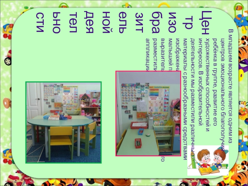 ребёнка в группе, развитие его художественных способностей и интересов. В изобразительной деятельности мы разместили различные материалы с разнообразными средствами изображения, с целью формирования у малышей представления об их выразительных возможностях. Кроме этого разместили материалы для лепки и аппликации.