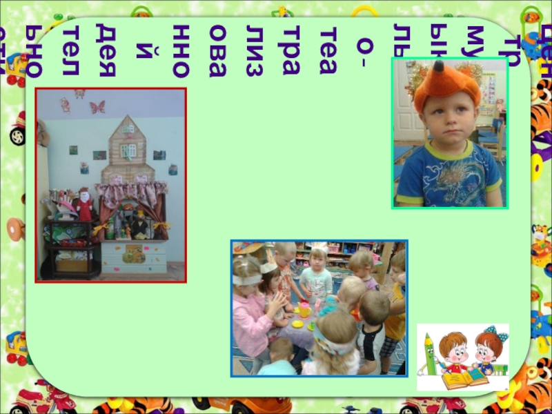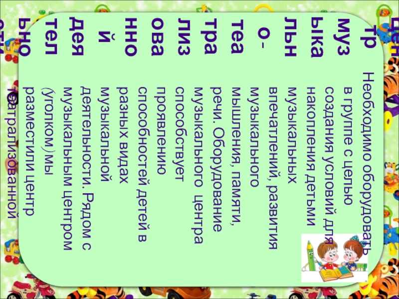 накопления детьми музыкальных впечатлений, развития музыкального мышления, памяти, речи. Оборудование музыкального центра способствует проявлению способностей детей в разных видах музыкальной деятельности. Рядом с музыкальным центром (уголком) мы разместили центр театрализованной деятельности, в которой разместили различные виды театров и внесли атрибуты для самостоятельной театрализованной деятельности детей.