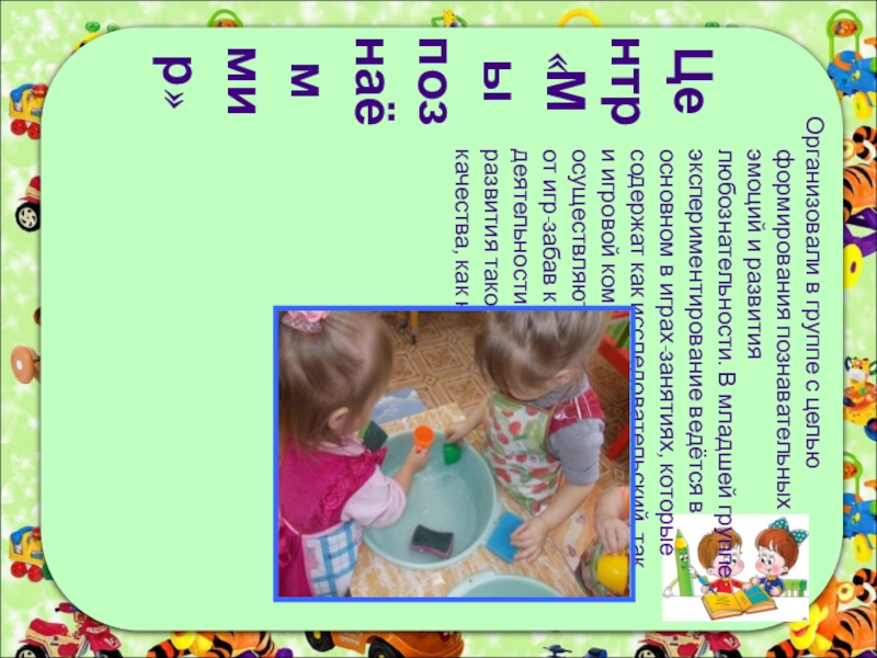 и развития любознательности. В младшей группе экспериментирование ведётся в основном в играх-занятиях, которые содержат как исследовательский, так и игровой компоненты и осуществляют постепенный переход от игр-забав к учебно-познавательной деятельности – они бесценны для развития такого замечательного качества, как наблюдательность.