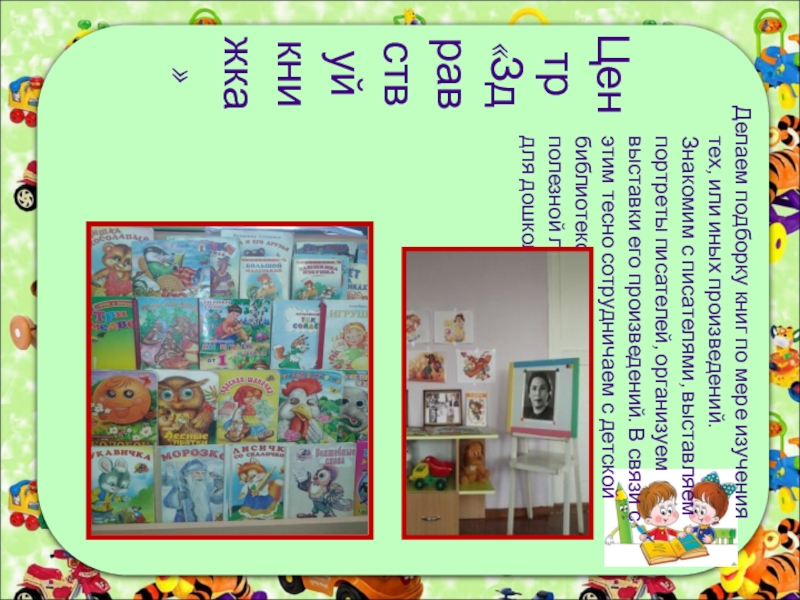произведений. Знакомим с писателями, выставляем портреты писателей, организуем выставки его произведений. В связи с этим тесно сотрудничаем с детской библиотекой. Приобретено много полезной литературы, энциклопедий для дошкольников.