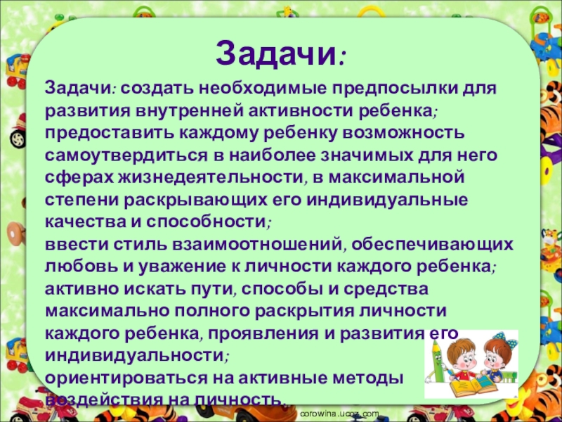 Задачи: создать необходимые предпосылки для развития внутренней активности ребенка;