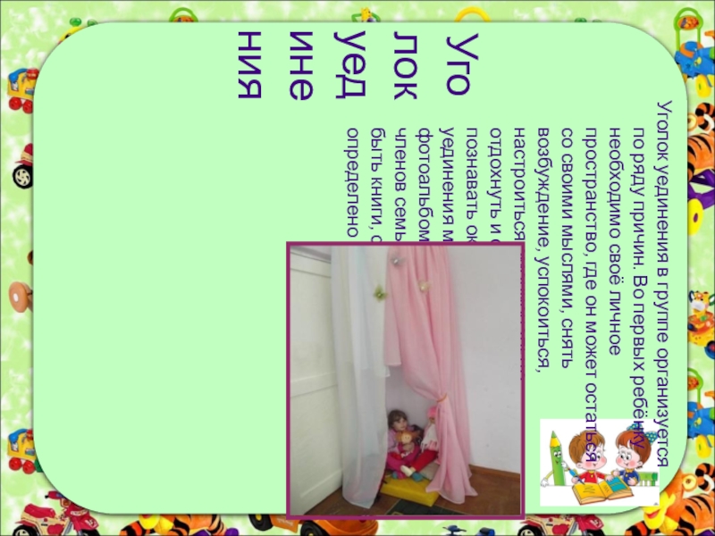 ребёнку необходимо своё личное пространство, где он может остаться со своими мыслями, снять возбуждение, успокоиться, настроиться эмоционально, отдохнуть и с новыми силами познавать окружающий мир. В уголке уединения могут быть размещены фотоальбомы с фотографиями членов семьи ребёнка, также могут быть книги, содержание которых определено возрастом детей.