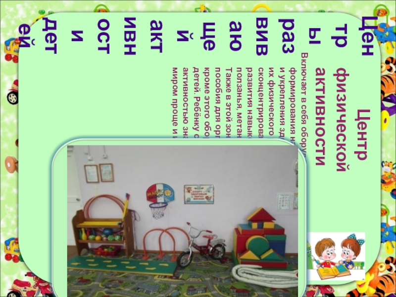 Включает в себя оборудование для формирования навыков детей, для охраны и укрепления здоровья дошкольников, для их физического развития. В этой зоне сконцентрировано оборудование для развития навыков ходьбы, бега, прыжков, ползанья, метания, катания, равновесия. Также в этой зоне находятся атрибуты и пособия для организации подвижных игр, и кроме этого оборудование для закаливания детей. Ребёнку с высокой двигательной активностью знакомиться с окружающим миром проще и интереснее.