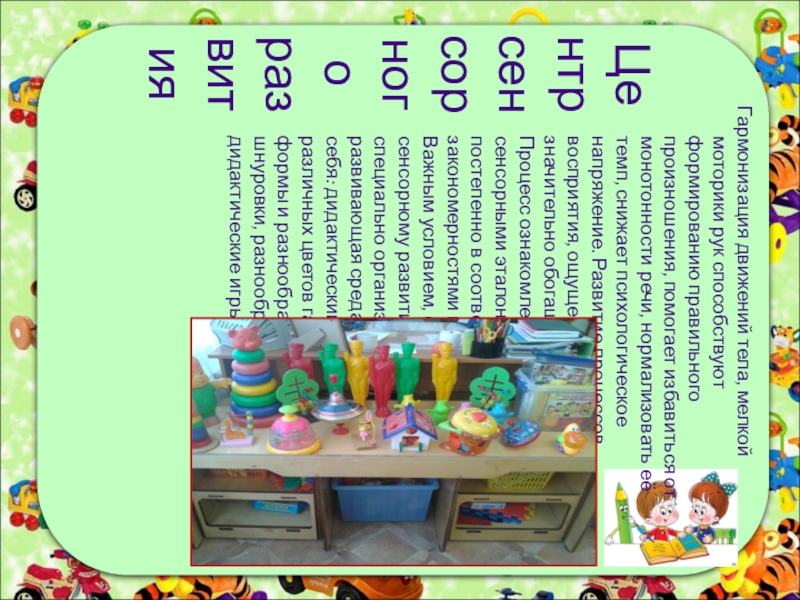 произношения, помогает избавиться от монотонности речи, нормализовать её темп, снижает психологическое напряжение. Развитие процессов восприятия, ощущения у детей значительно обогащает мышление. Процесс ознакомления ребёнка с сенсорными эталонами происходит постепенно в соответствии с закономерностями младшего возраста. Важным условием, способствующим сенсорному развитию является специально организованная развивающая среда, которая включает в себя: дидактический стол, пирамидки, различных цветов гаммы, различной формы и разнообразной фактуры, шнуровки, разнообразные вкладыши, дидактические игры и т.д.