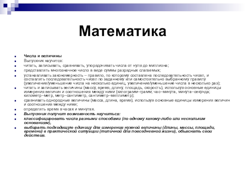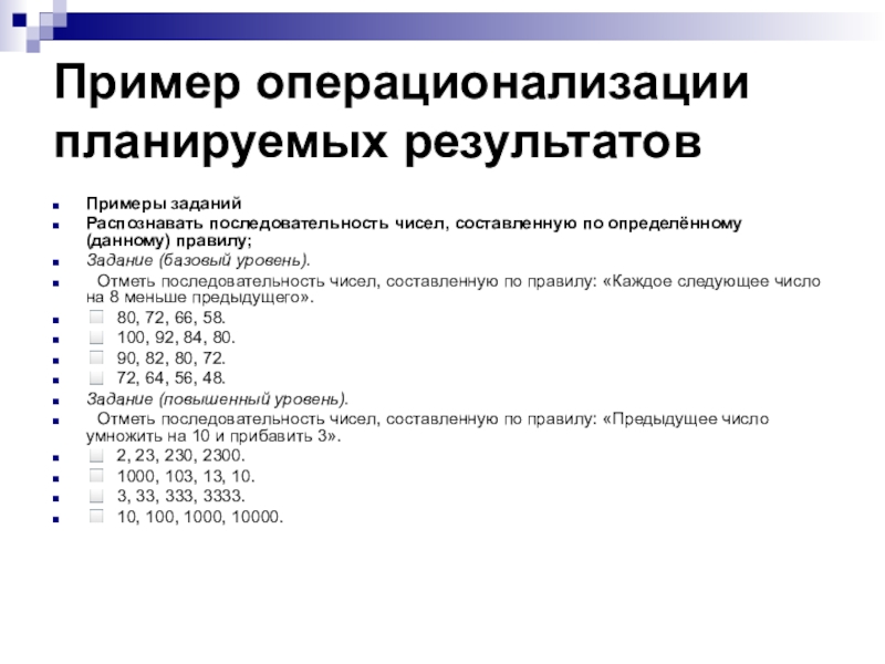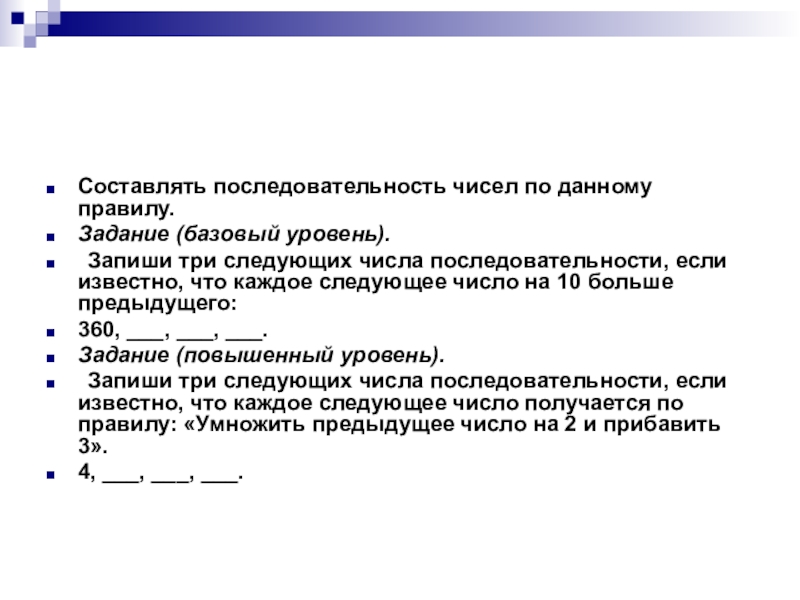 устанавливать закономерность – правило, по которому составлена последовательность чисел, и составлять последовательность чисел по заданному или самостоятельно выбранному правилу (увеличение/уменьшение числа на несколько единиц, увеличение/уменьшение числа в несколько раз);