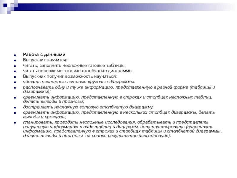 планировать, проводить несложные исследования, обрабатывать и представлять полученную информацию в виде таблиц и диаграмм, интерпретировать (сравнивать информацию, представленную в строках и столбцах таблицы и столбчатой диаграммы, делать выводы и прогнозы на основе результатов исследования).