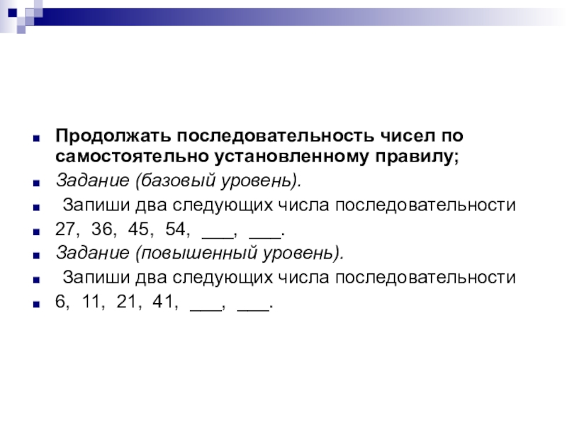 Дополнять последовательность чисел (вписывать пропущенное число) по самостоятельно установленному правилу;