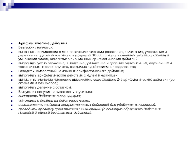 выполнять устно сложение, вычитание, умножение и деление однозначных, двузначных и трехзначных чисел в случаях, сводимых к действиям в пределах ста;