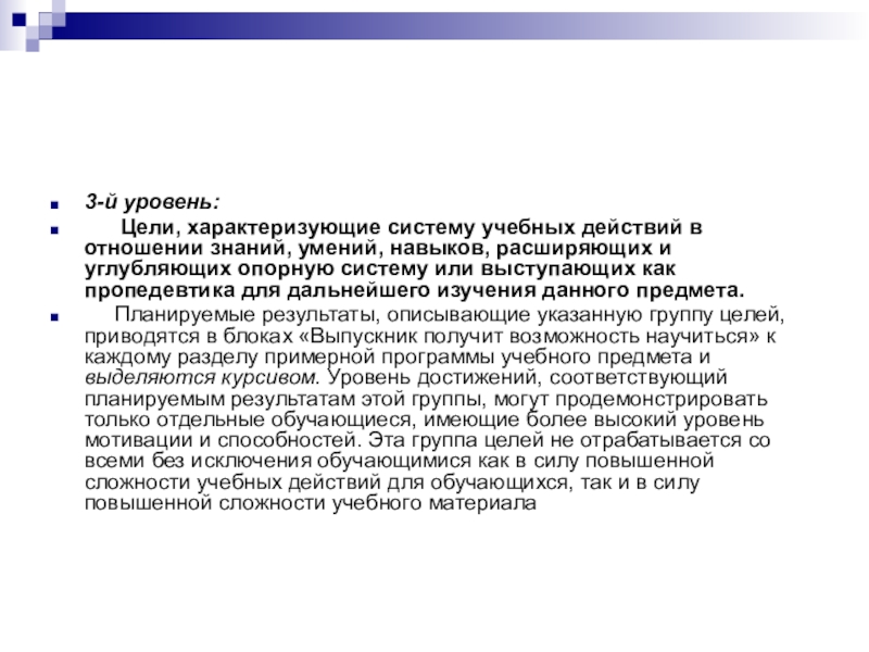 Планируемые результаты, описывающие указанную группу целей, приводятся в блоках «Выпускник получит возможность научиться» к каждому разделу примерной программы учебного предмета и выделяются курсивом. Уровень достижений, соответствующий планируемым результатам этой группы, могут продемонстрировать только отдельные обучающиеся, имеющие более высокий уровень мотивации и способностей. Эта группа целей не отрабатывается со всеми без исключения обучающимися как в силу повышенной сложности учебных действий для обучающихся, так и в силу повышенной сложности учебного материала