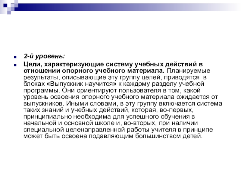 Планируемые результаты, описывающие эту группу целей, приводятся в блоках «Выпускник научится» к каждому разделу учебной программы. Они ориентируют пользователя в том, какой уровень освоения опорного учебного материала ожидается от выпускников. Иными словами, в эту группу включается система таких знаний и учебных действий, которая, во-первых, принципиально необходима для успешного обучения в начальной и основной школе и, во-вторых, при наличии специальной целенаправленной работы учителя в принципе может быть освоена подавляющим большинством детей.
