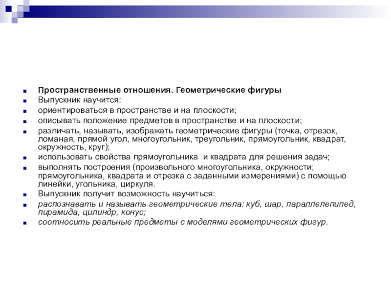 различать, называть, изображать геометрические фигуры (точка, отрезок, ломаная, прямой угол, многоугольник, треугольник, прямоугольник, квадрат, окружность, круг);