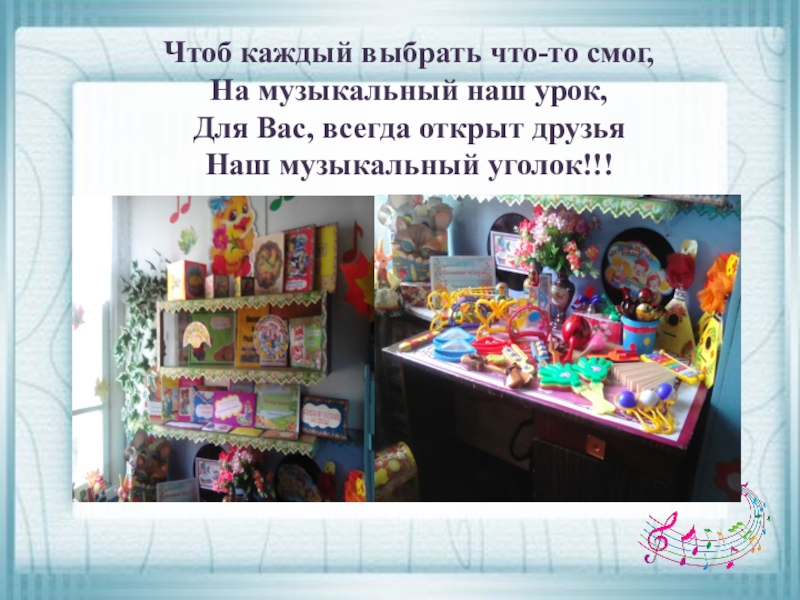 Чтоб каждый выбрать что-то смог,На музыкальный наш урок, Для Вас, всегда открыт друзьяНаш музыкальный уголок!!!