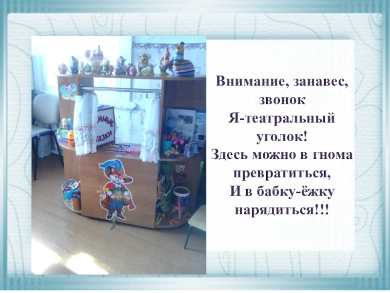 Внимание, занавес, звонокЯ-театральный уголок!Здесь можно в гнома превратиться,И в бабку-ёжку нарядиться!!!