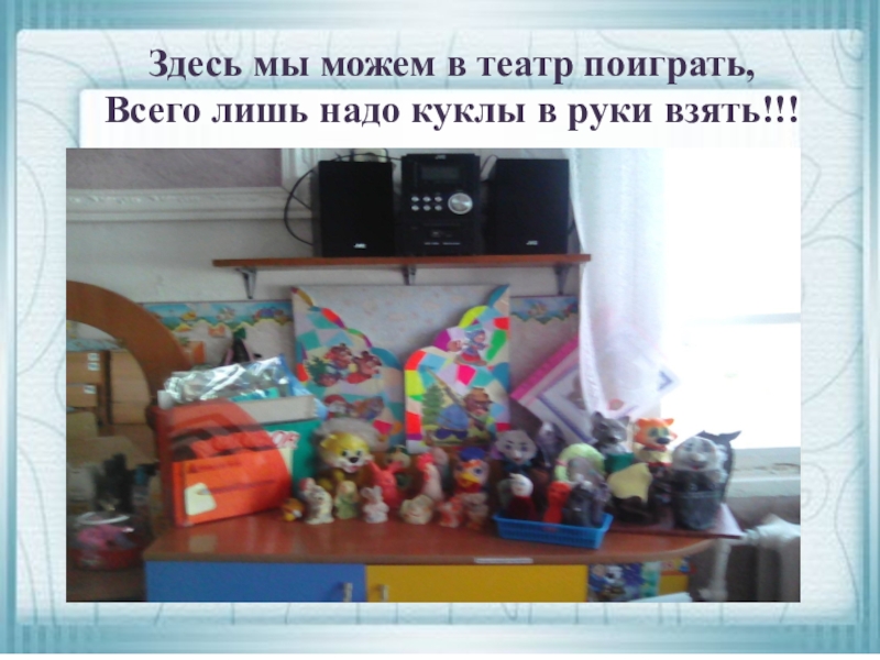 Здесь мы можем в театр поиграть,Всего лишь надо куклы в руки взять!!!