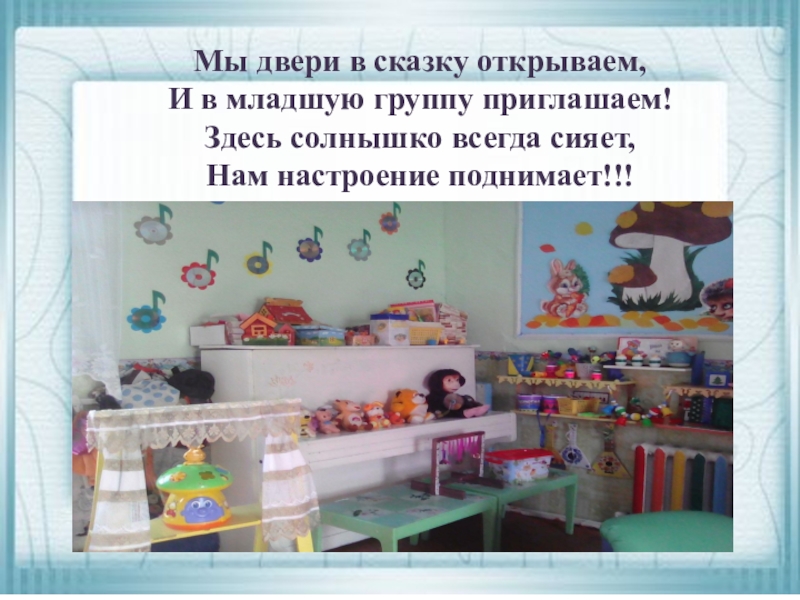 Слайд 3Мы двери в сказку открываем, И в младшую группу приглашаем! Здесь солнышко