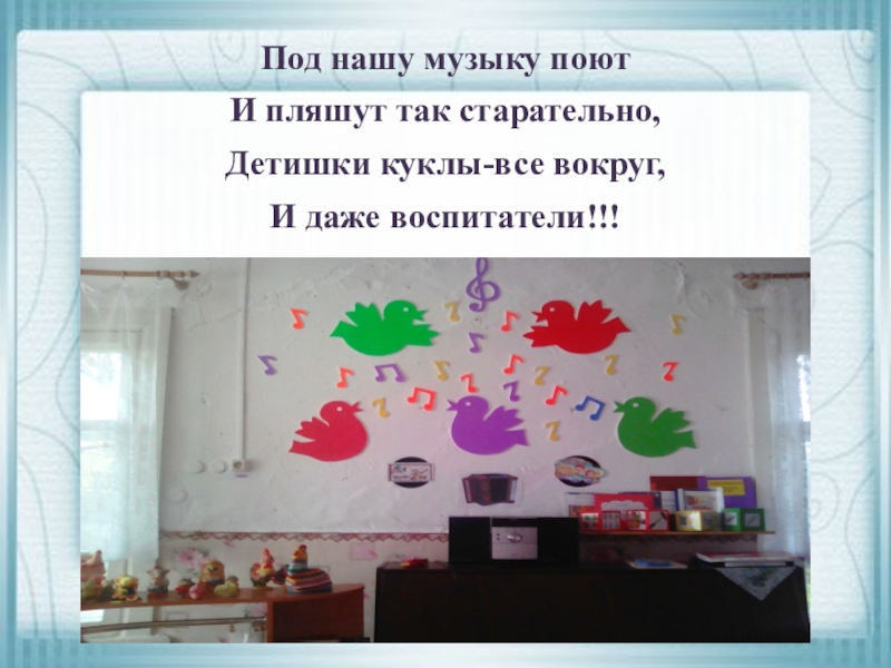 Под нашу музыку поют И пляшут так старательно,Детишки куклы-все вокруг, И даже воспитатели!!!