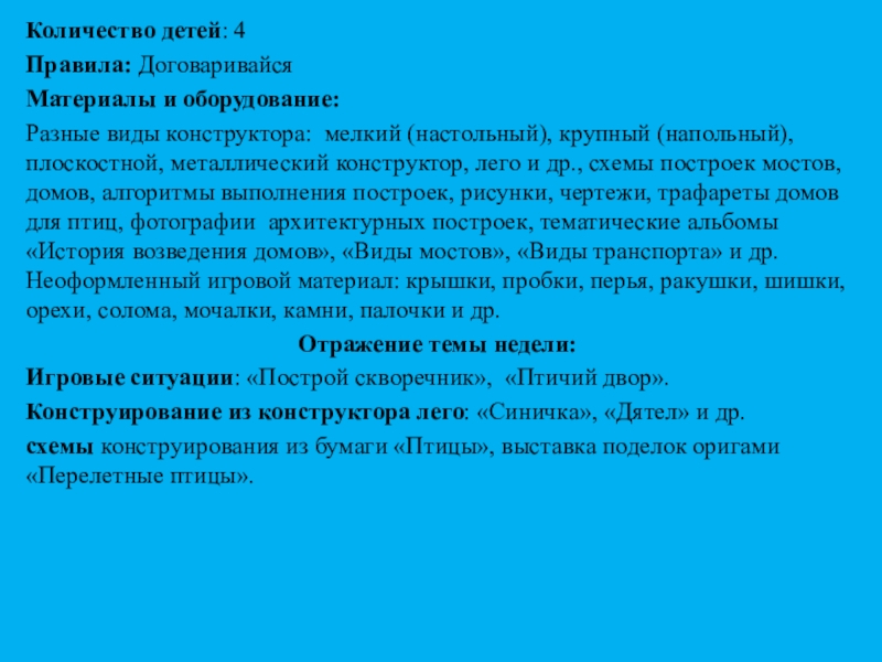крупный (напольный), плоскостной, металлический конструктор, лего и др., схемы построек мостов, домов, алгоритмы выполнения построек, рисунки, чертежи, трафареты домов для птиц, фотографии архитектурных построек, тематические альбомы «История возведения домов», «Виды мостов», «Виды транспорта» и др. Неоформленный игровой материал: крышки, пробки, перья, ракушки, шишки, орехи, солома, мочалки, камни, палочки и др.